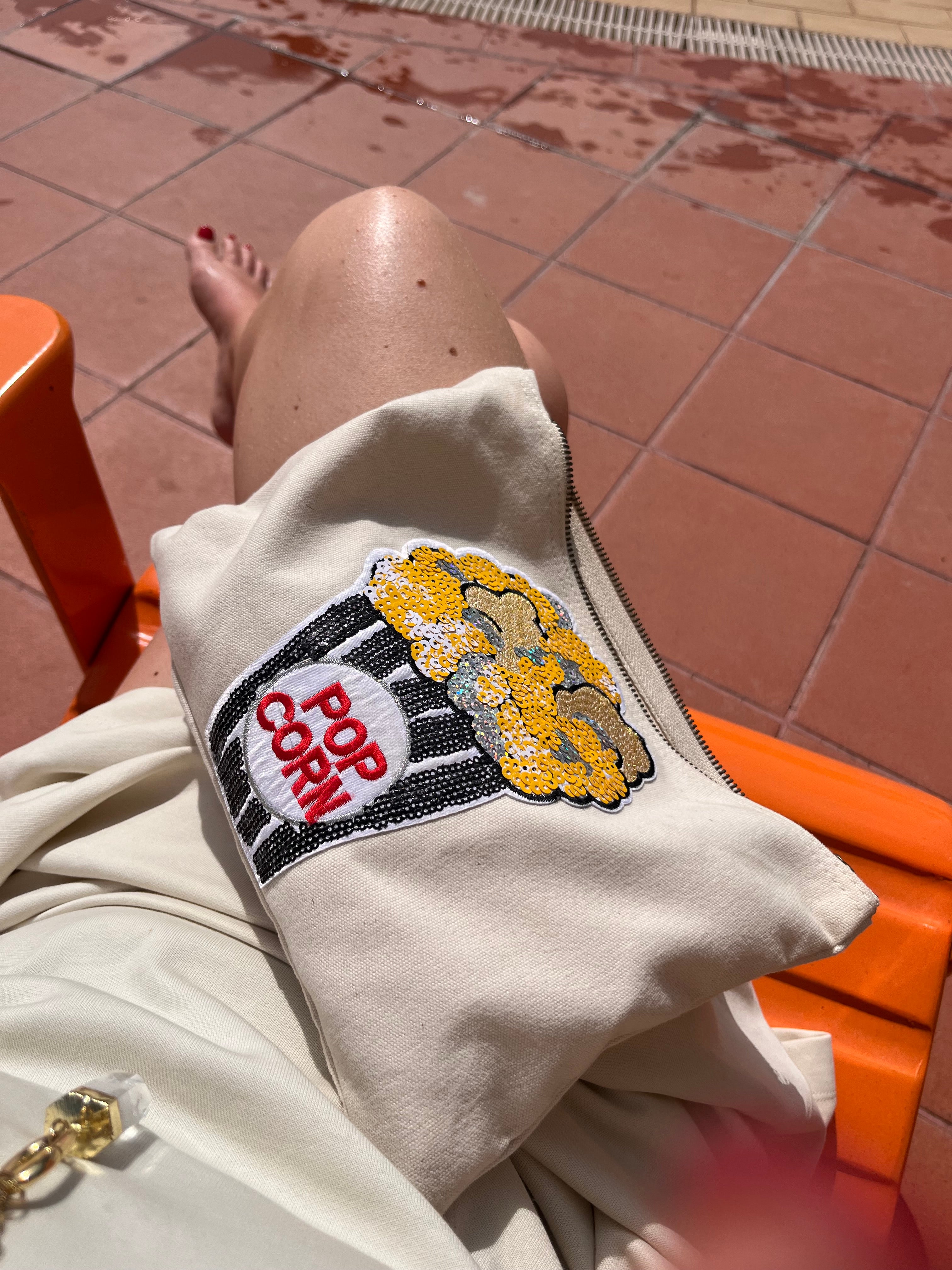 Add a pop of fun to your look with this playful sequin pouch! Featuring a bold popcorn design made of shimmering sequins, this cream-colored clutch is perfect for make up, days out, pool days, or whenever you’re feeling extra. Spacious enough to carry your essentials, with a secure zip closure and a soft canvas feel, it's the ultimate accessory for anyone who likes their style with a side of sequins.