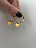 HOOP EARRINGS CAN BE STAMPED WITH TWO LETTERS OR NUMBERS.