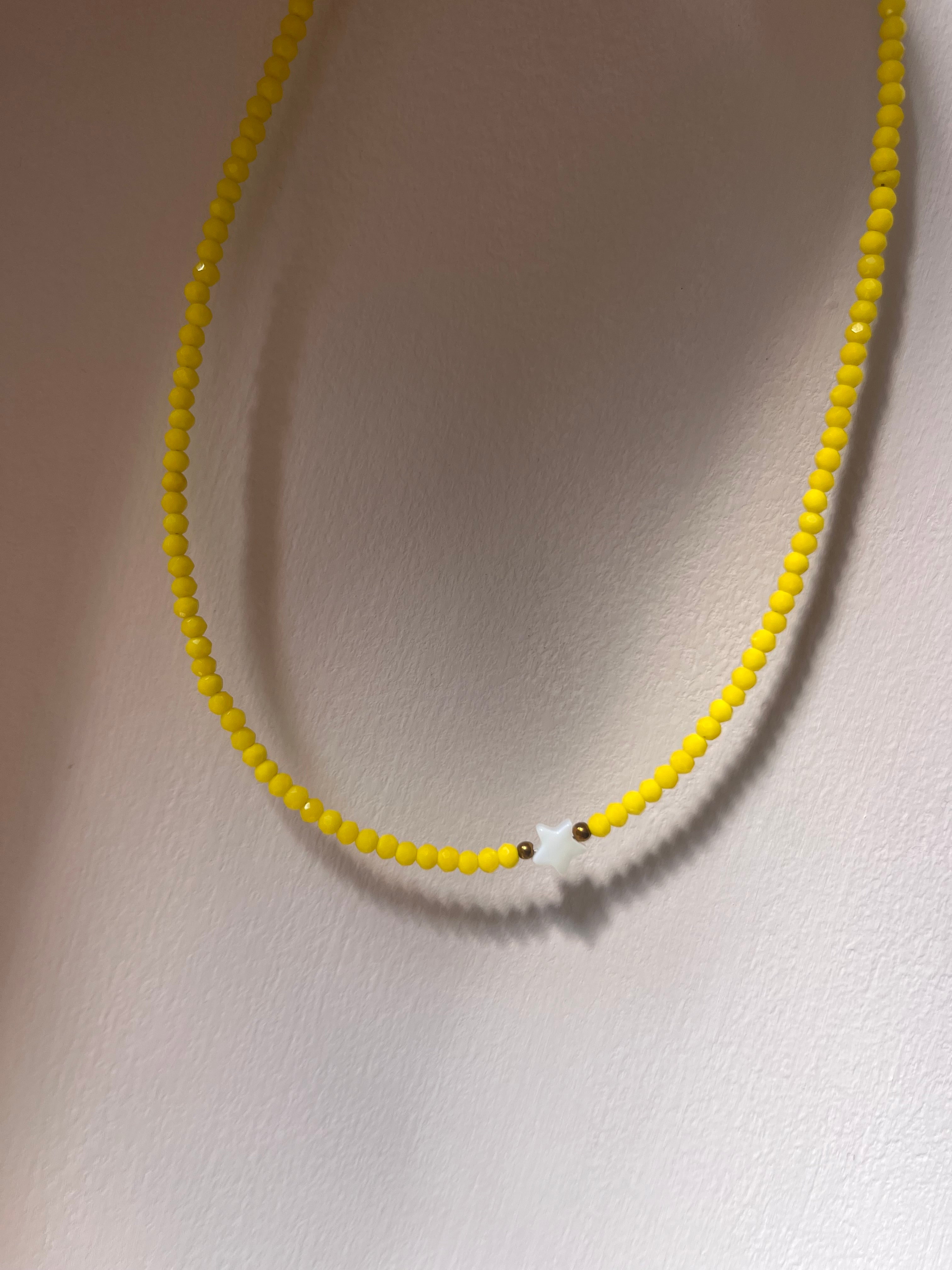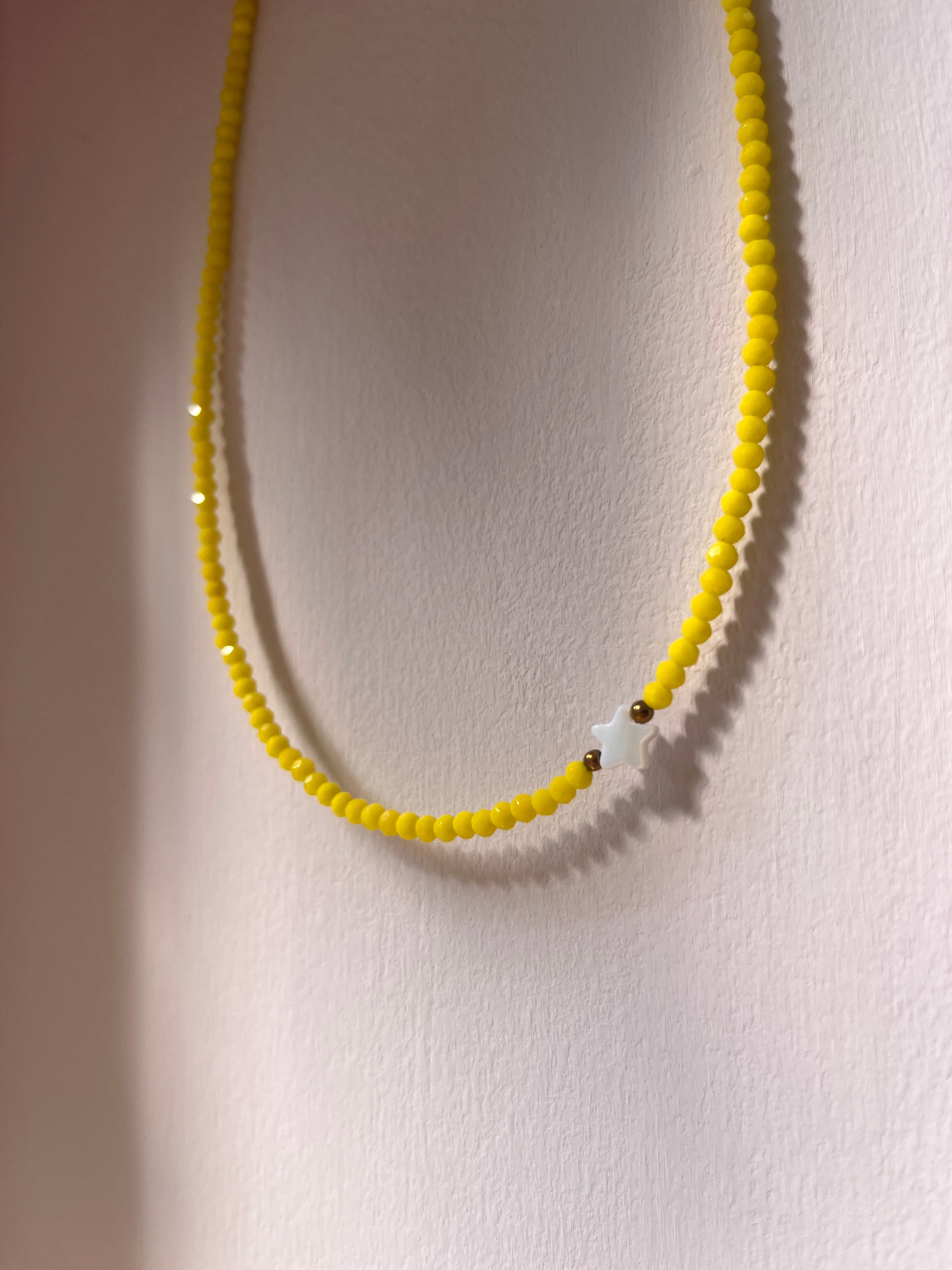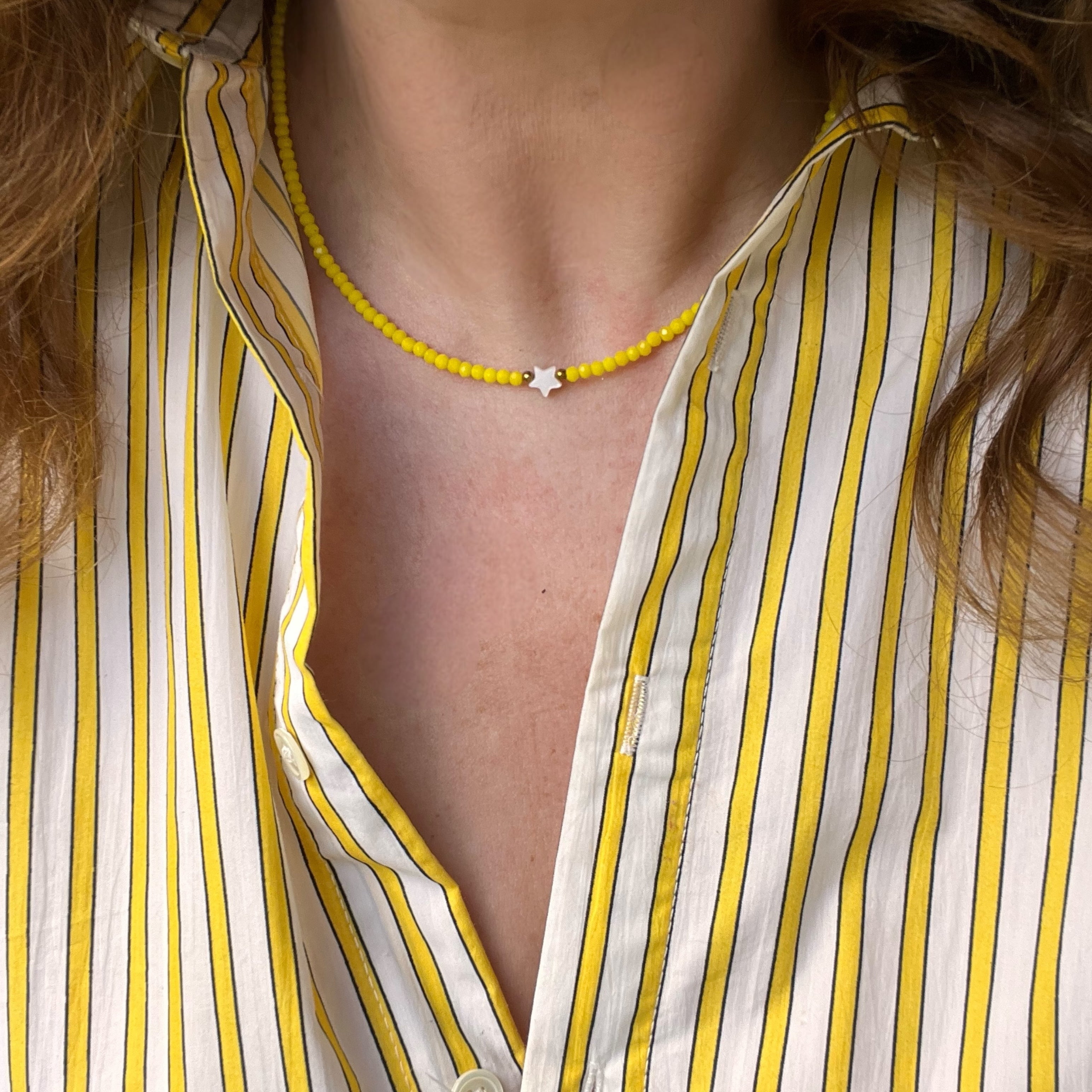 Bring sunshine to your style with this yellow beaded necklace featuring a delicate mother of pearl star charm.