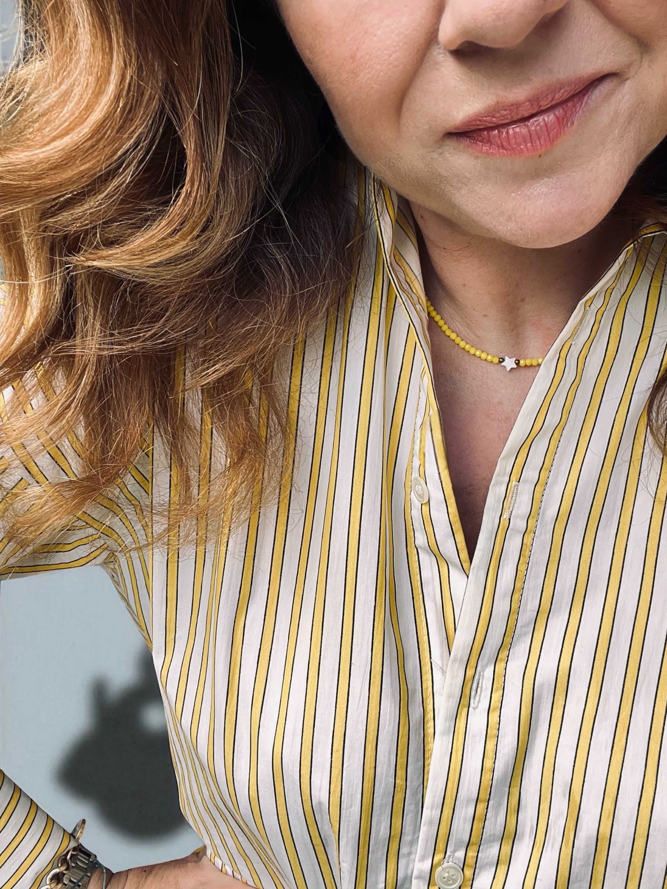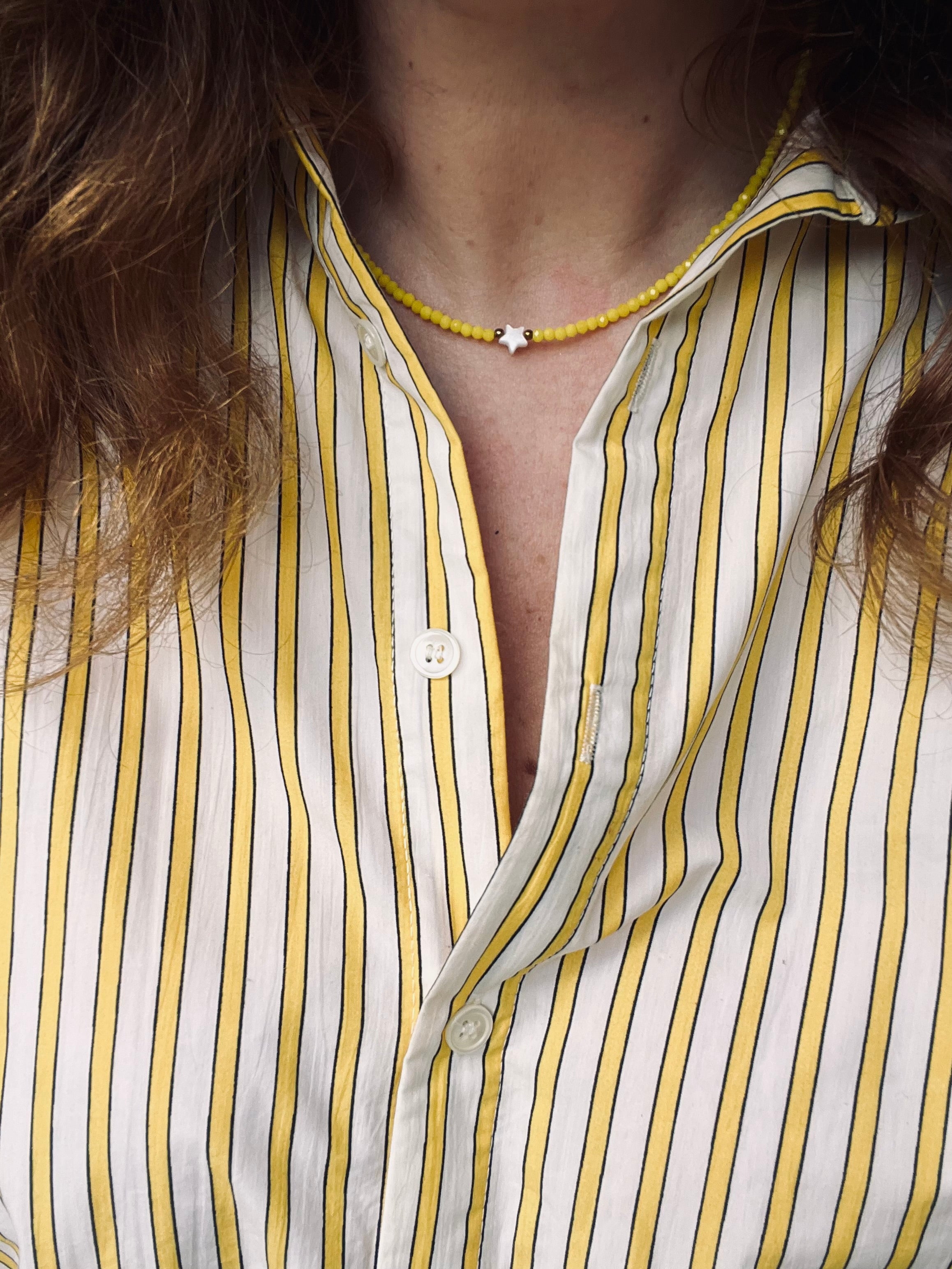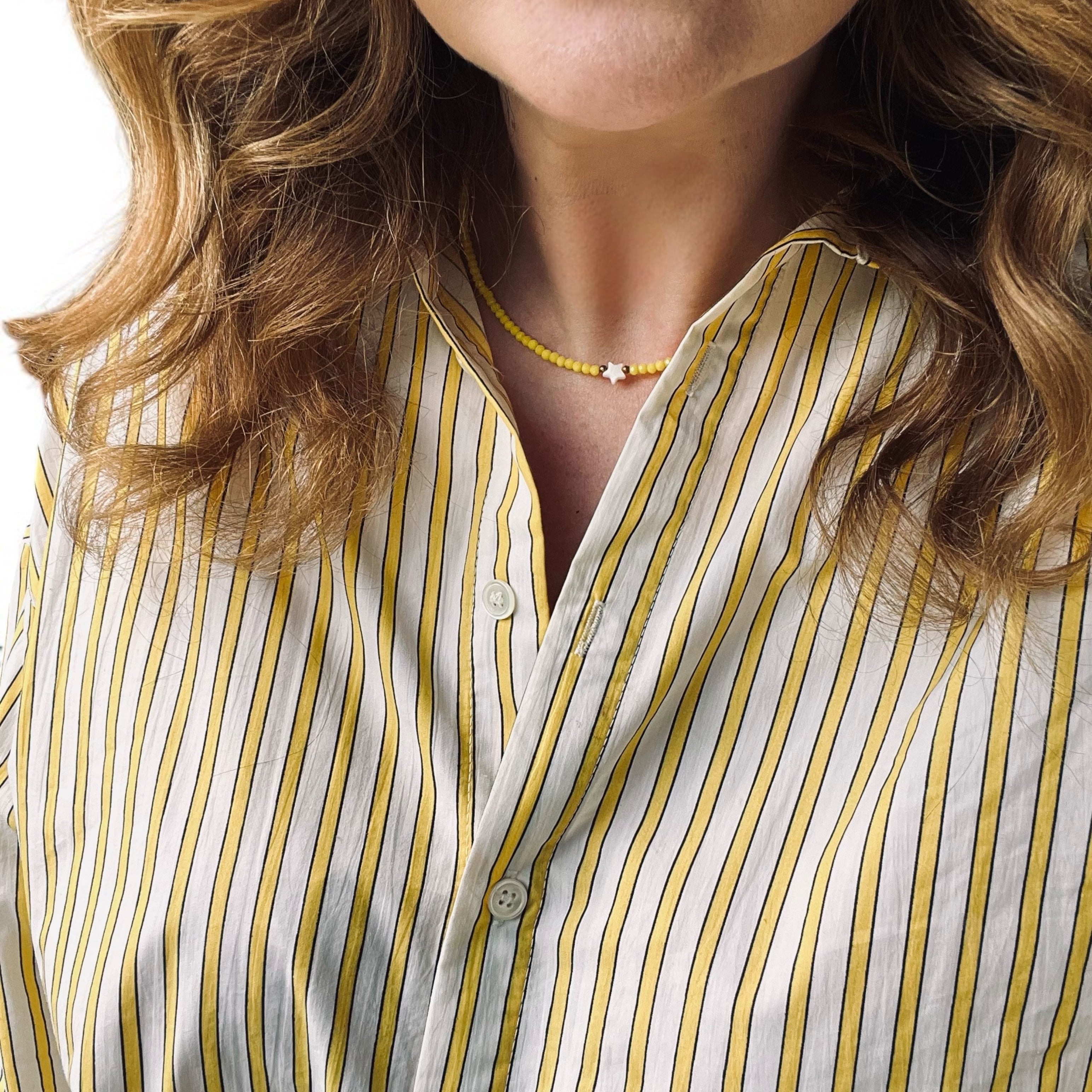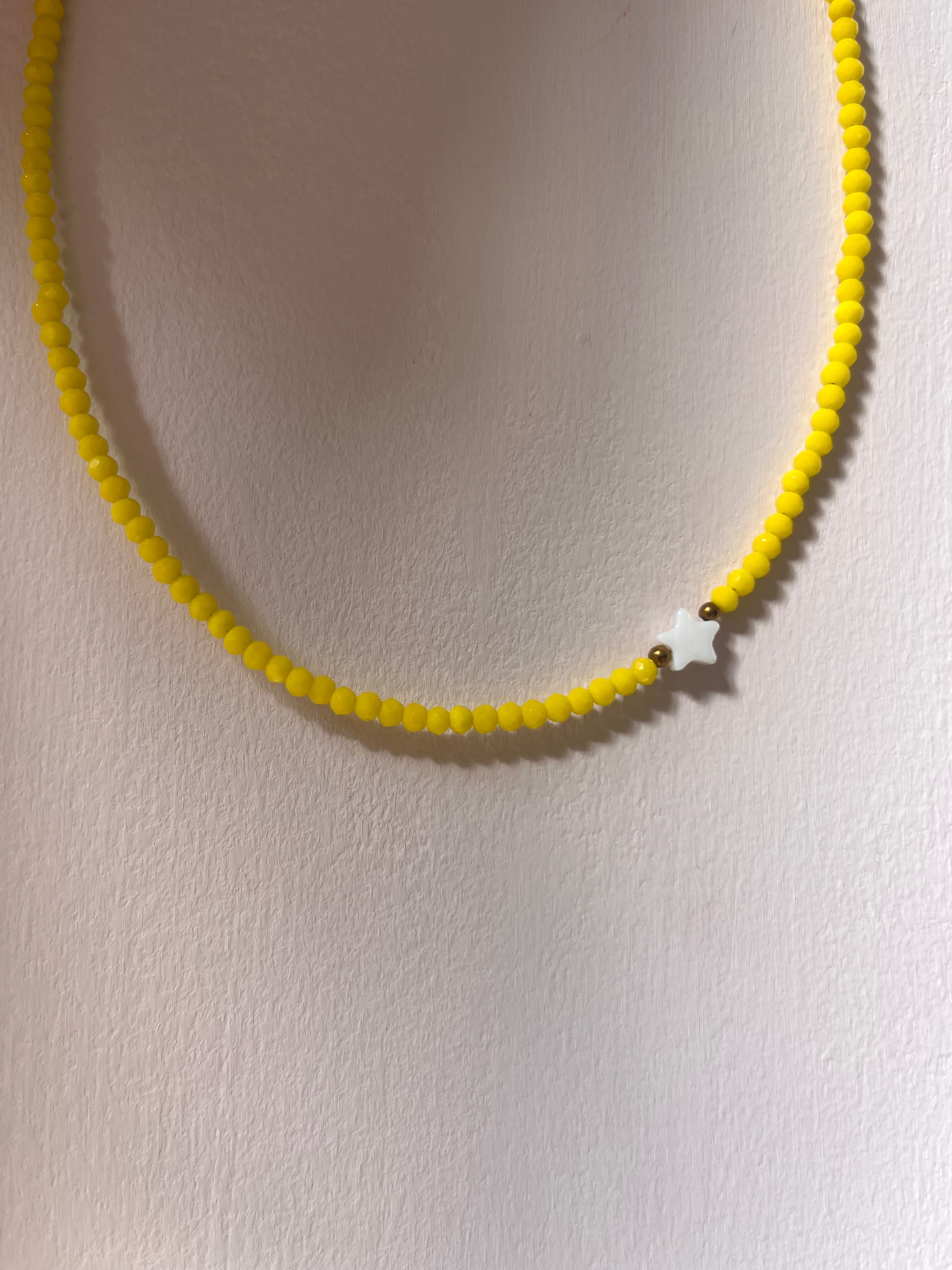 Bring sunshine to your style with this yellow beaded necklace featuring a delicate mother of pearl star charm.
