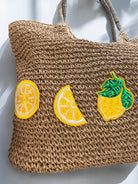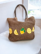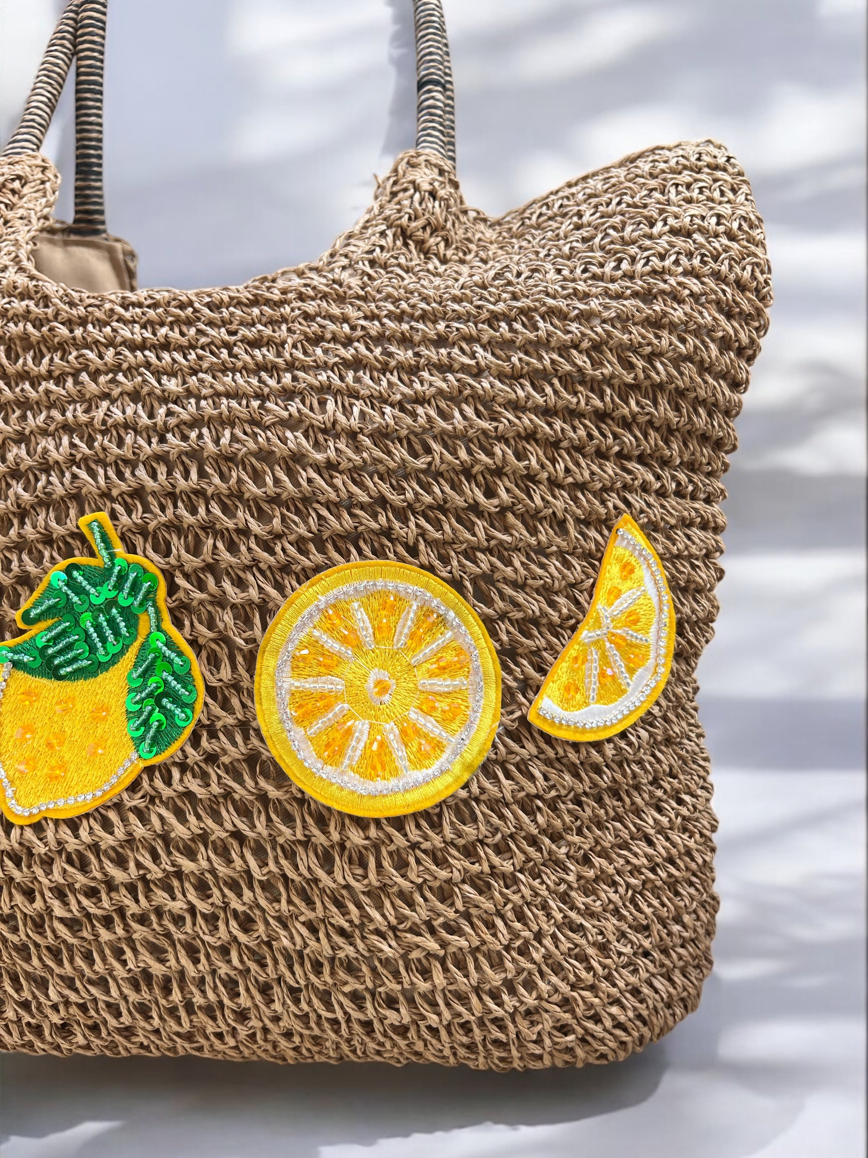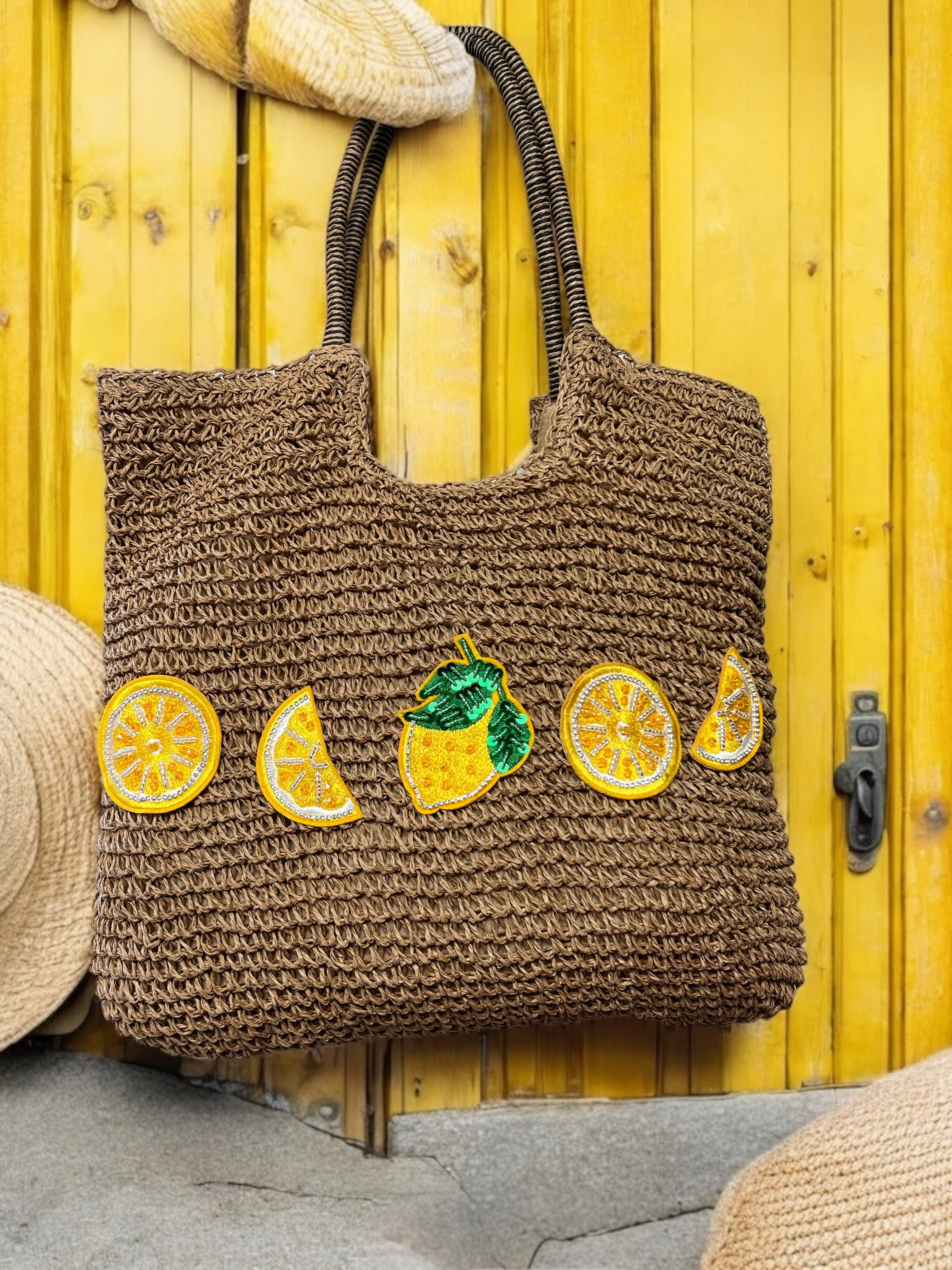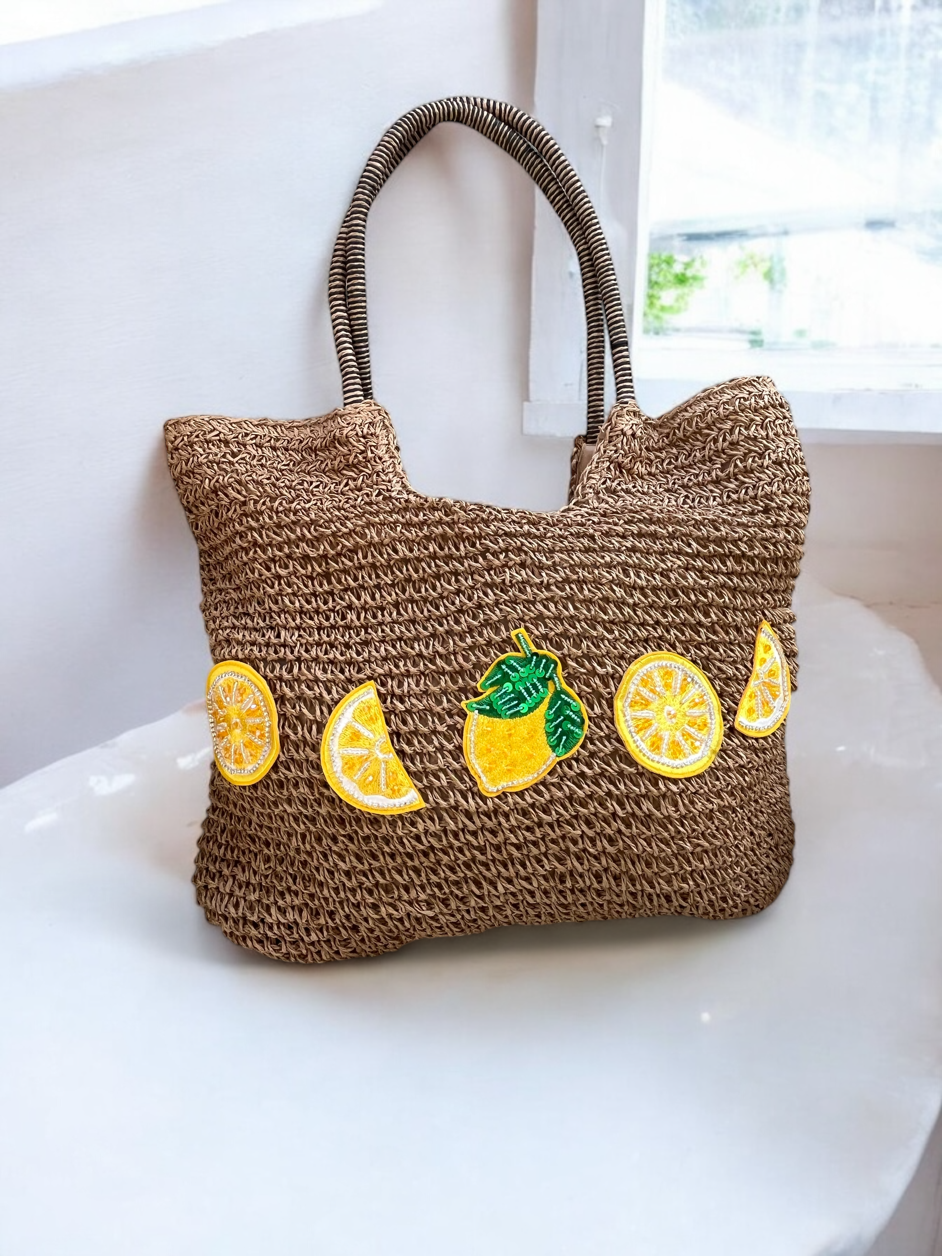 Crafted from natural fibers, this roomy bag features durable twisted rope handles and is adorned with vibrant hand-beaded lemon and citrus slice motifs. The bright yellow and green beadwork pops beautifully against the earthy texture of the bag, bringing a fun, fruity flair to your summer wardrobe. Perfect for vacations, picnics, or adding a splash of joy to your everyday look.