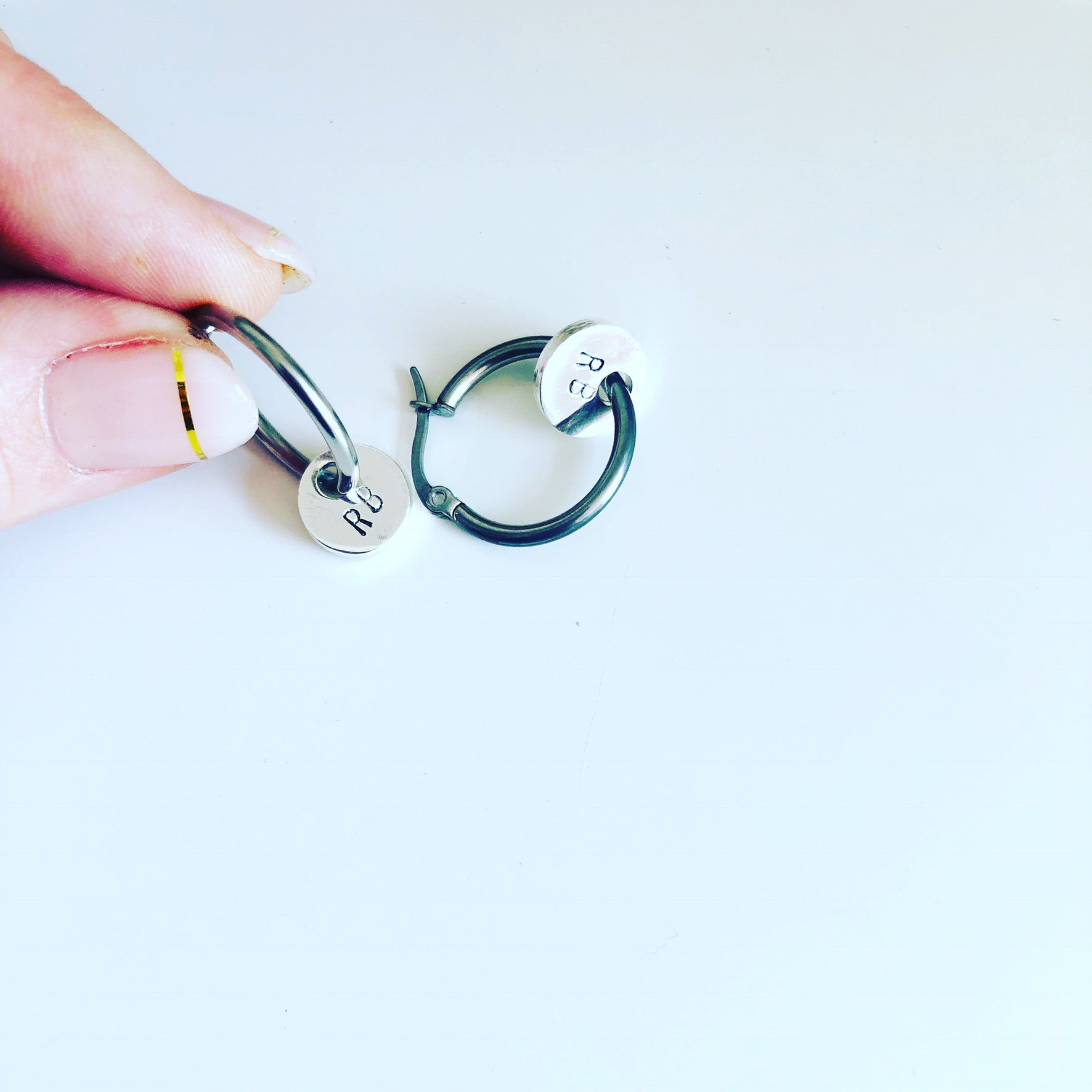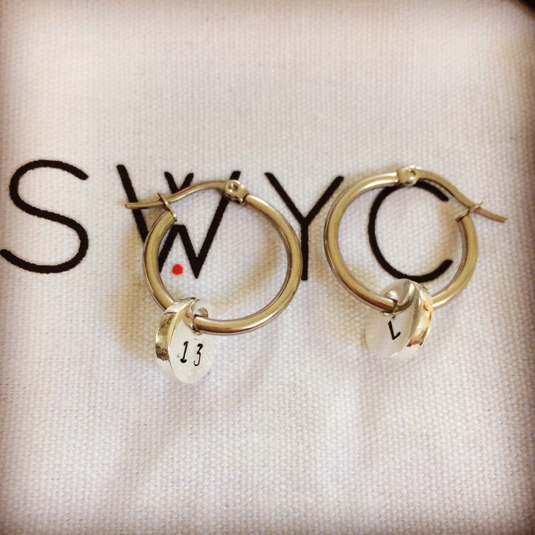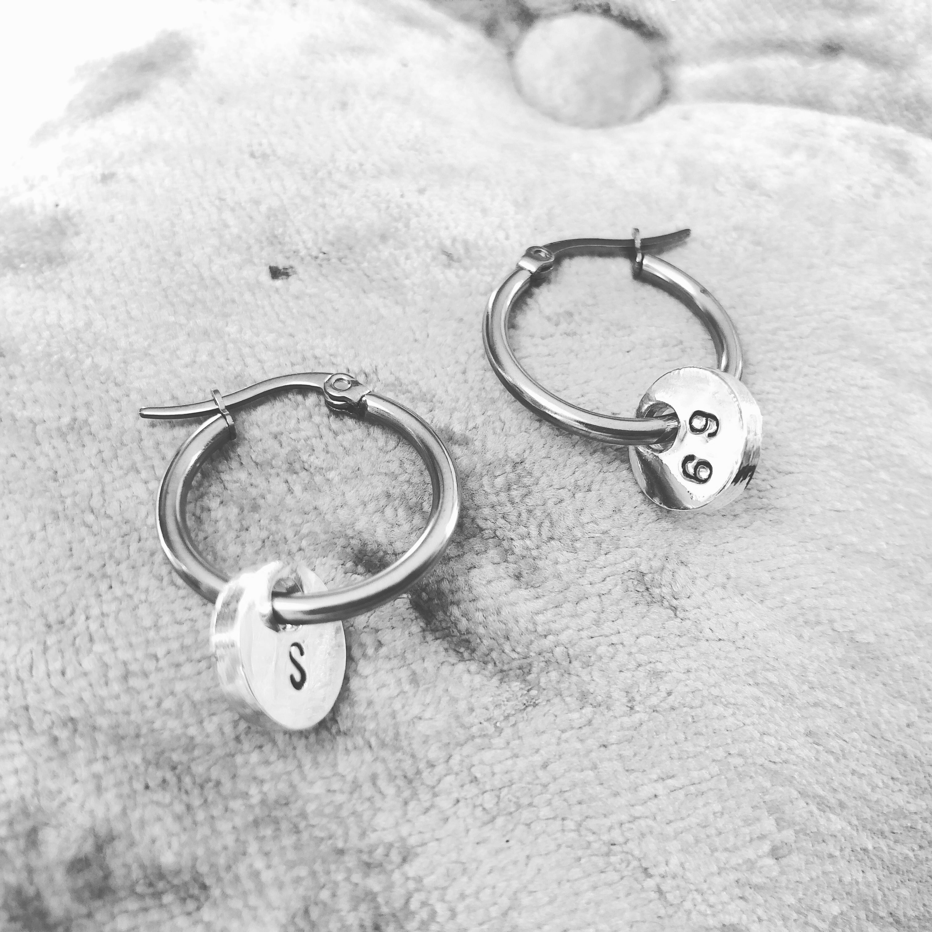 HOOP EARRINGS CAN BE STAMPED WITH TWO LETTERS OR NUMBERS.