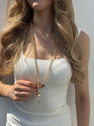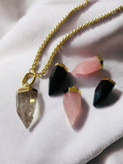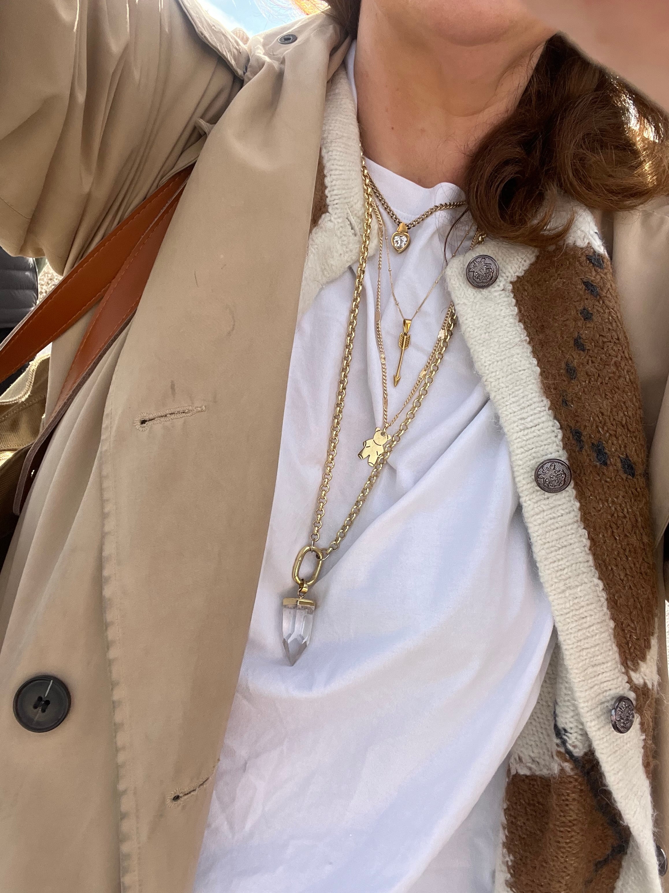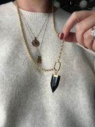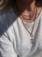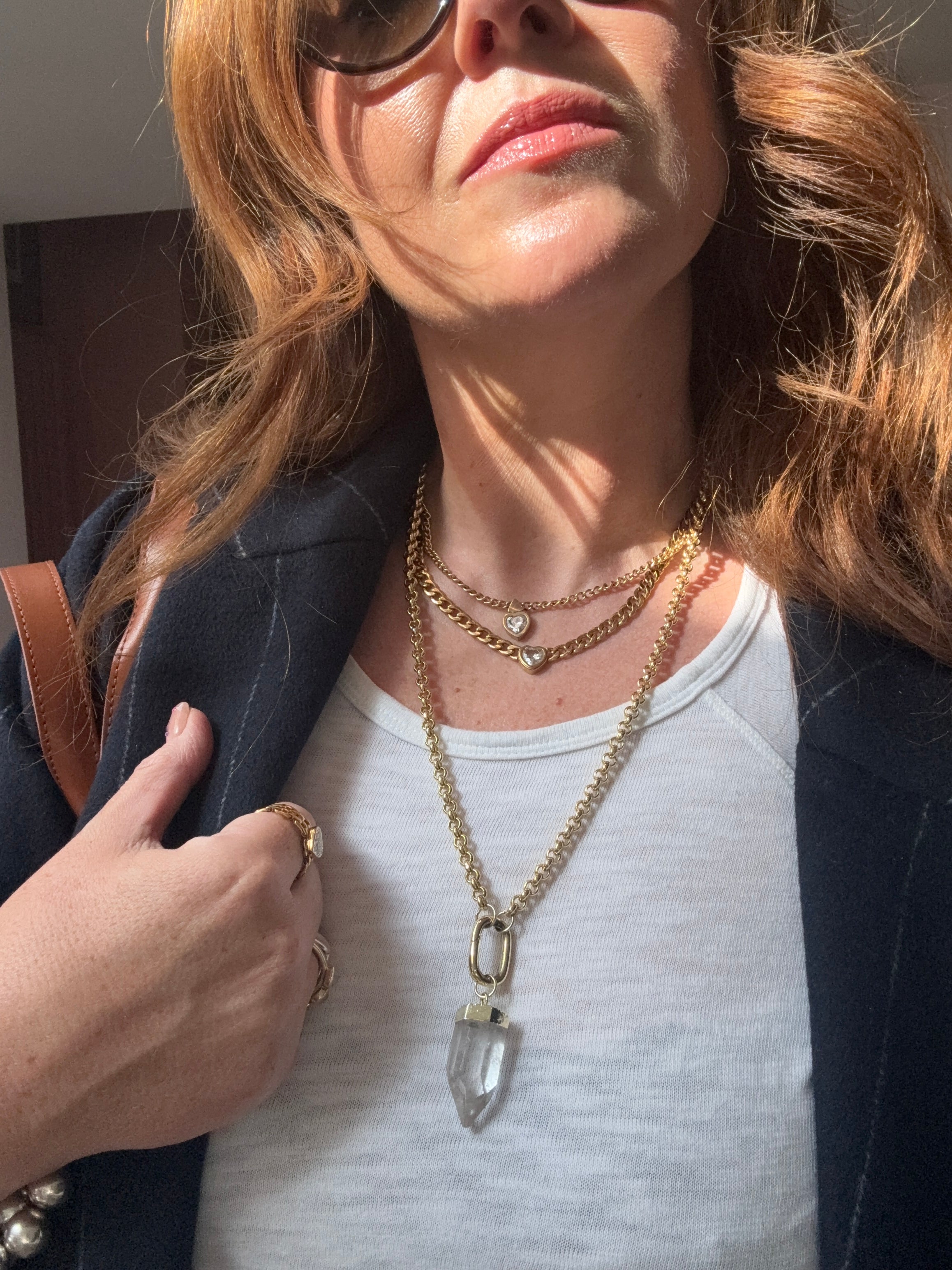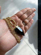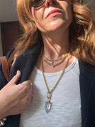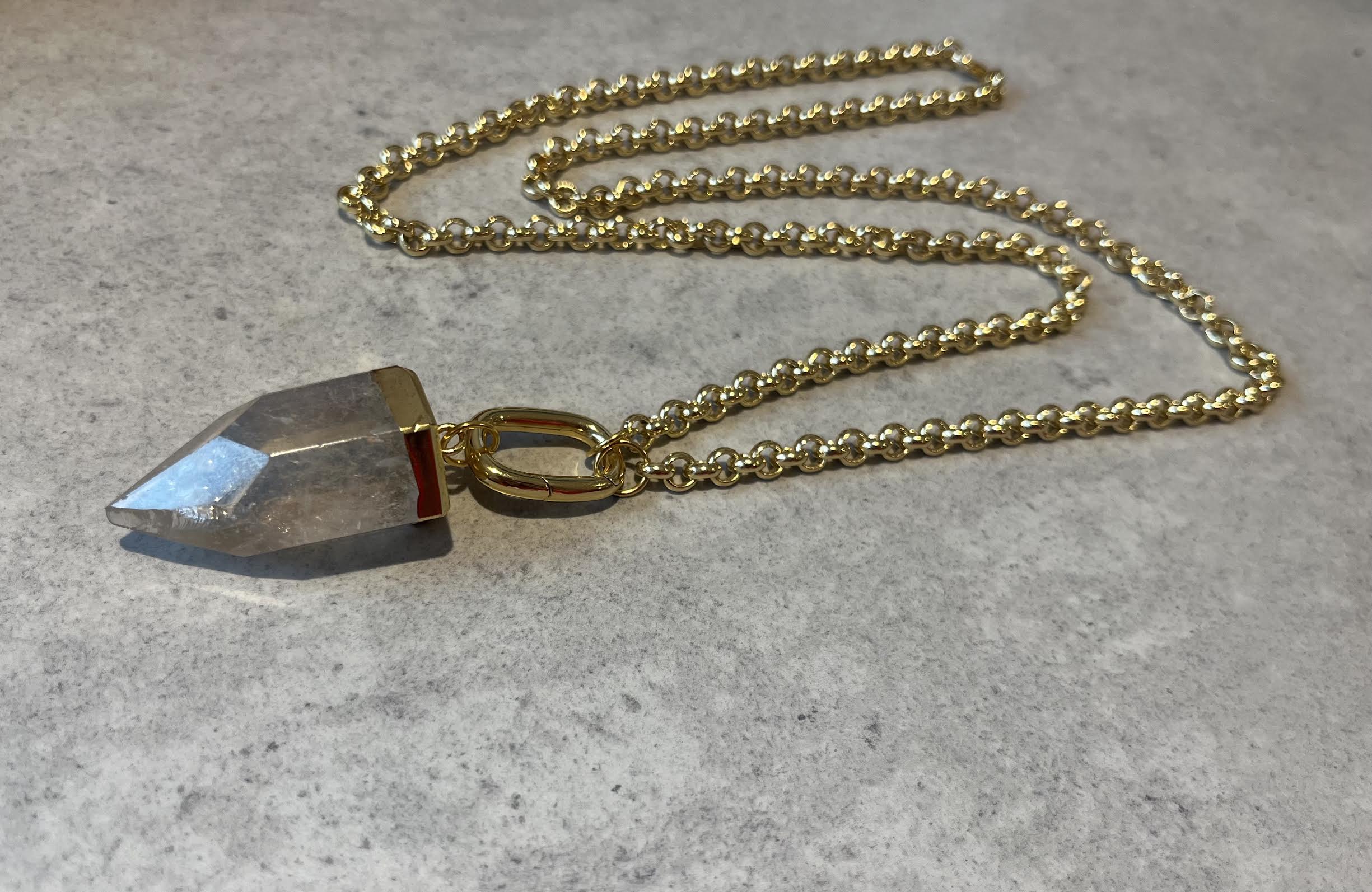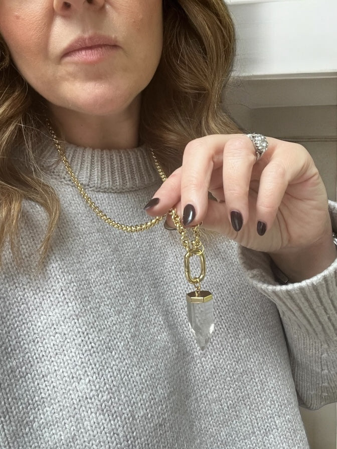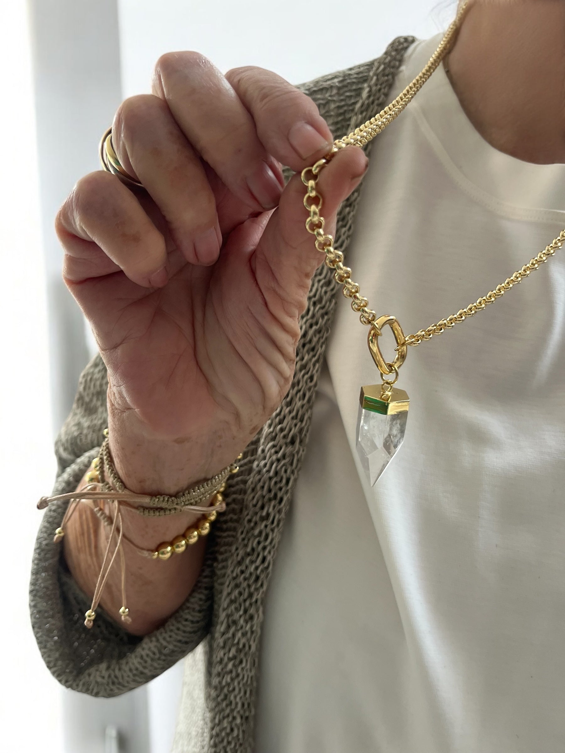 Clean, powerful, and effortlessly bold. Our Crystal Quartz necklace features a sleek, pointed quartz pendant suspended from a chunky gold link chain — a striking blend of natural energy and statement style.