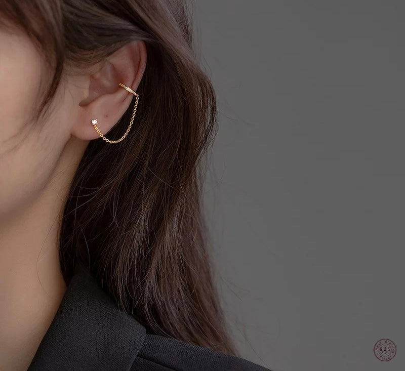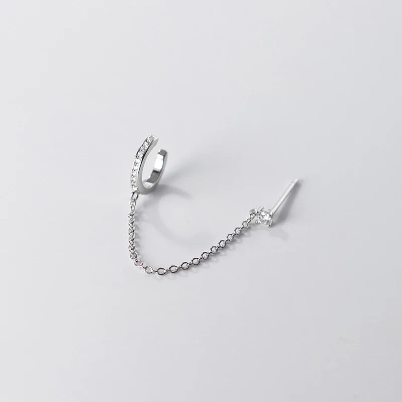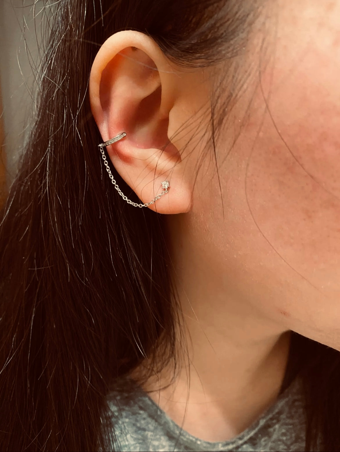 Divine diamanté stud earring with additional diamanté ear cuff attached by a fine chain. Absolutely perfect to add to multiple piercings and to add the illusion of an extra piercing due to the cuff attachment