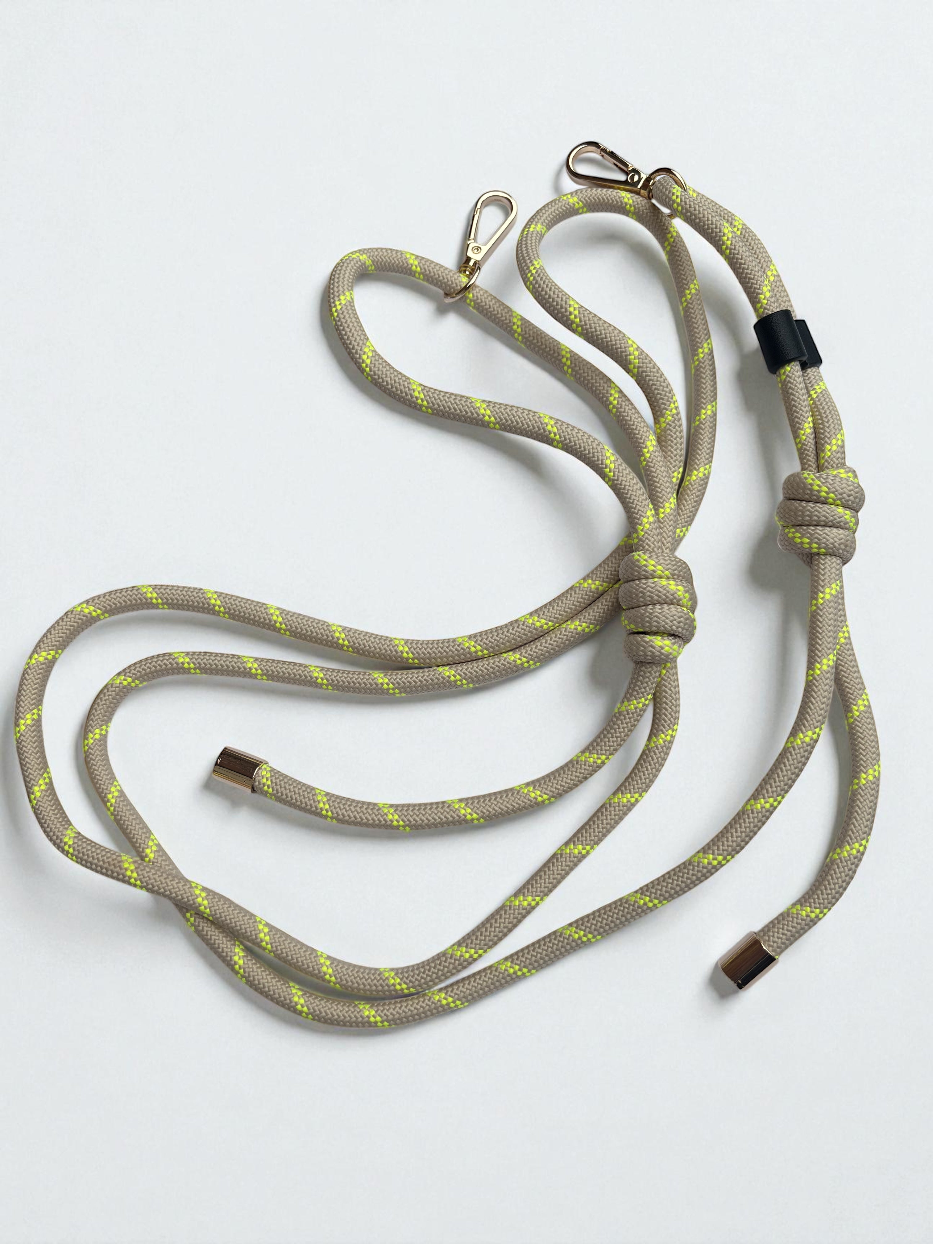Super versatile it can be worn on the shoulder or crossbody due to the multiple straps. Each bag includes the Charlie (camel and yellow) knot rope strap as shown.