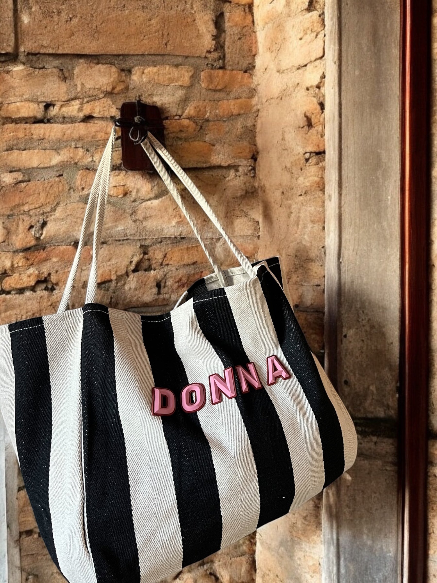 In retro stripes of black and off-white you can add any name or word in our rubber patches.