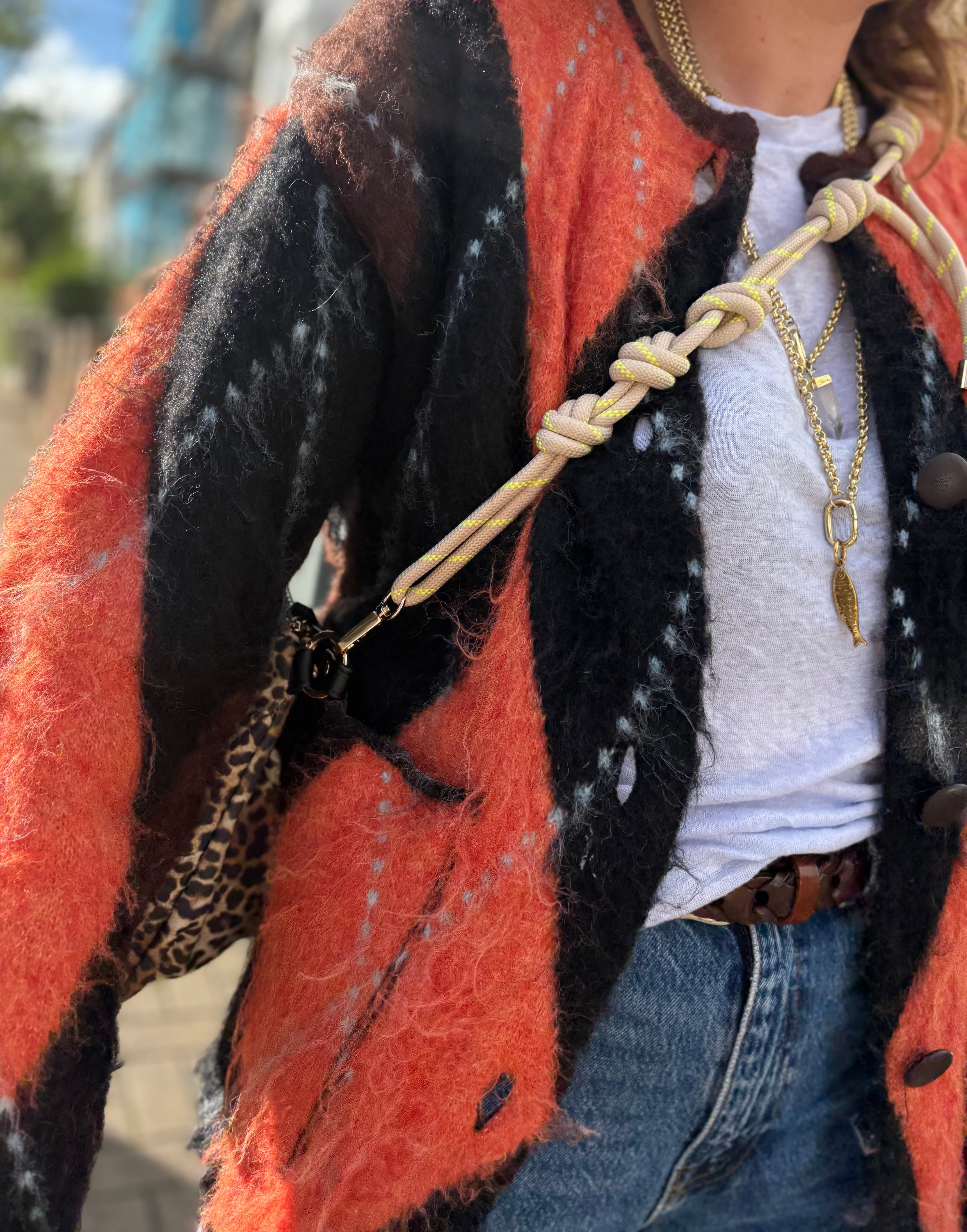 Super versatile it can be worn on the shoulder or crossbody due to the multiple straps. Each bag includes the JENNA knot rope strap as shown.