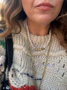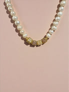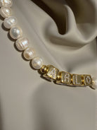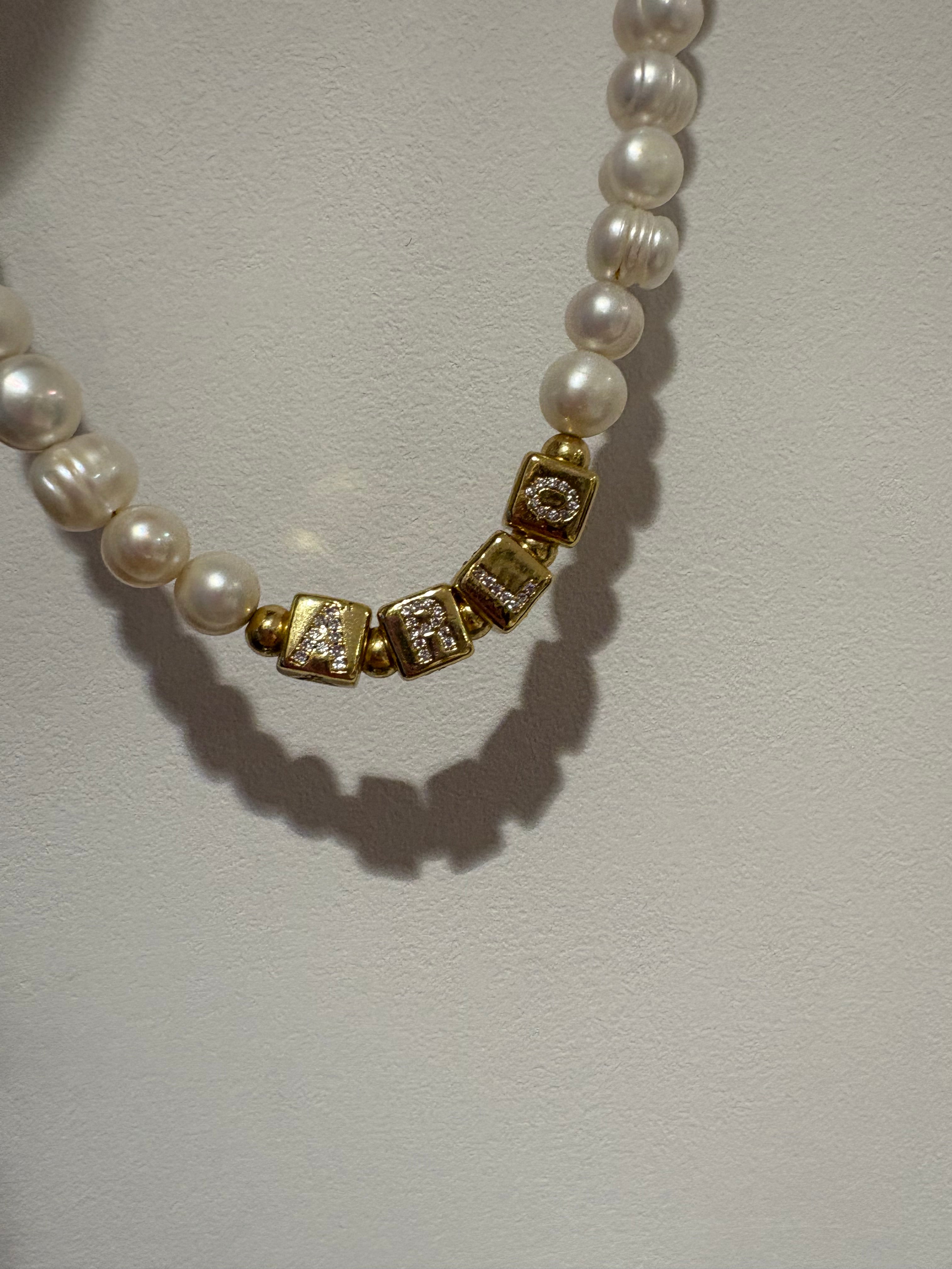 This necklace features hand-strung pearls paired with gold letter beads to create a clean, understated look.