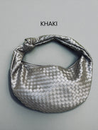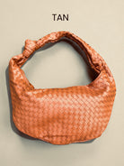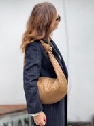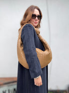This woven shoulder bag brings texture and warmth to any look, with its soft shape and autumnal tone. Made from premium vegan leather, it’s lightweight, easy to carry, and spacious enough for everyday essentials.