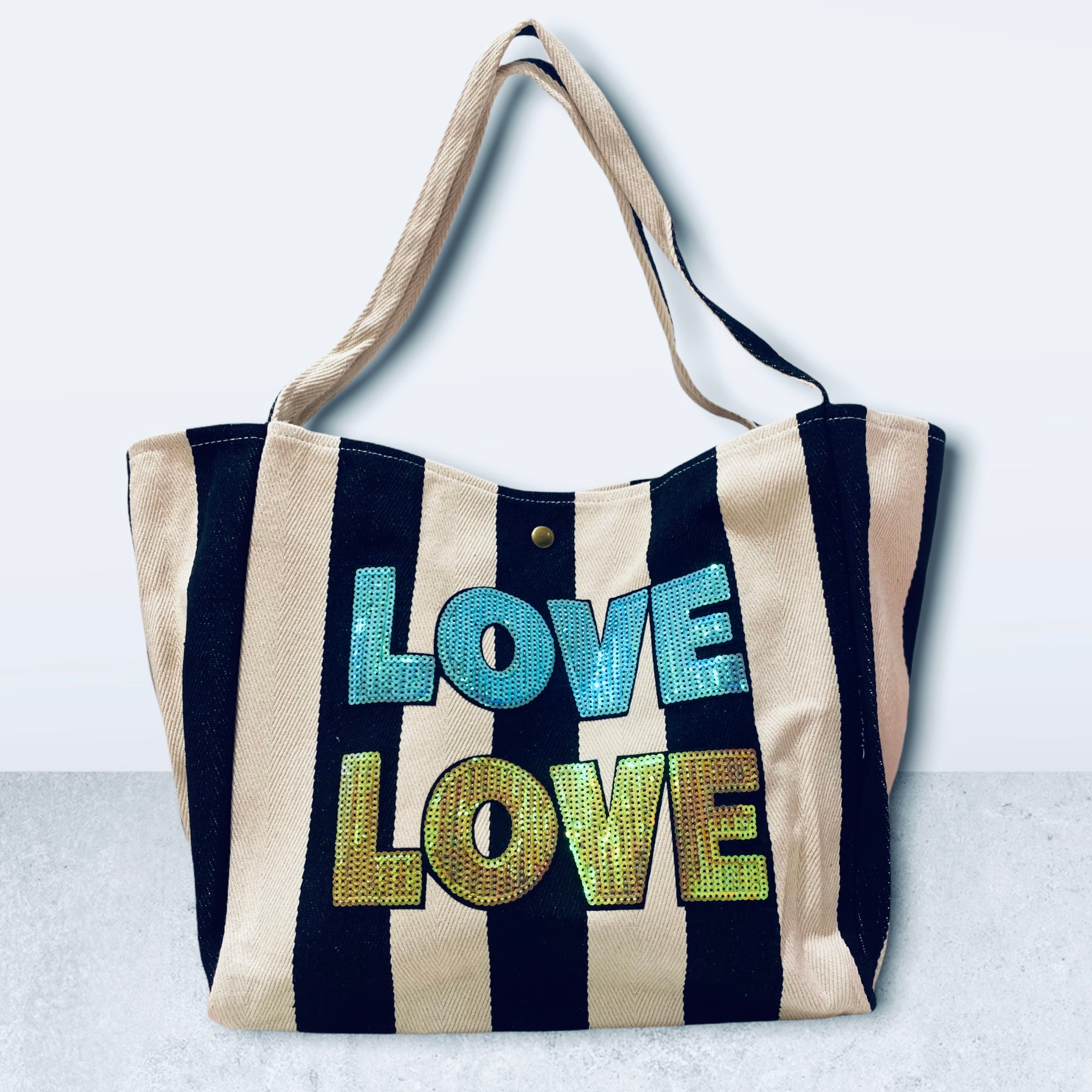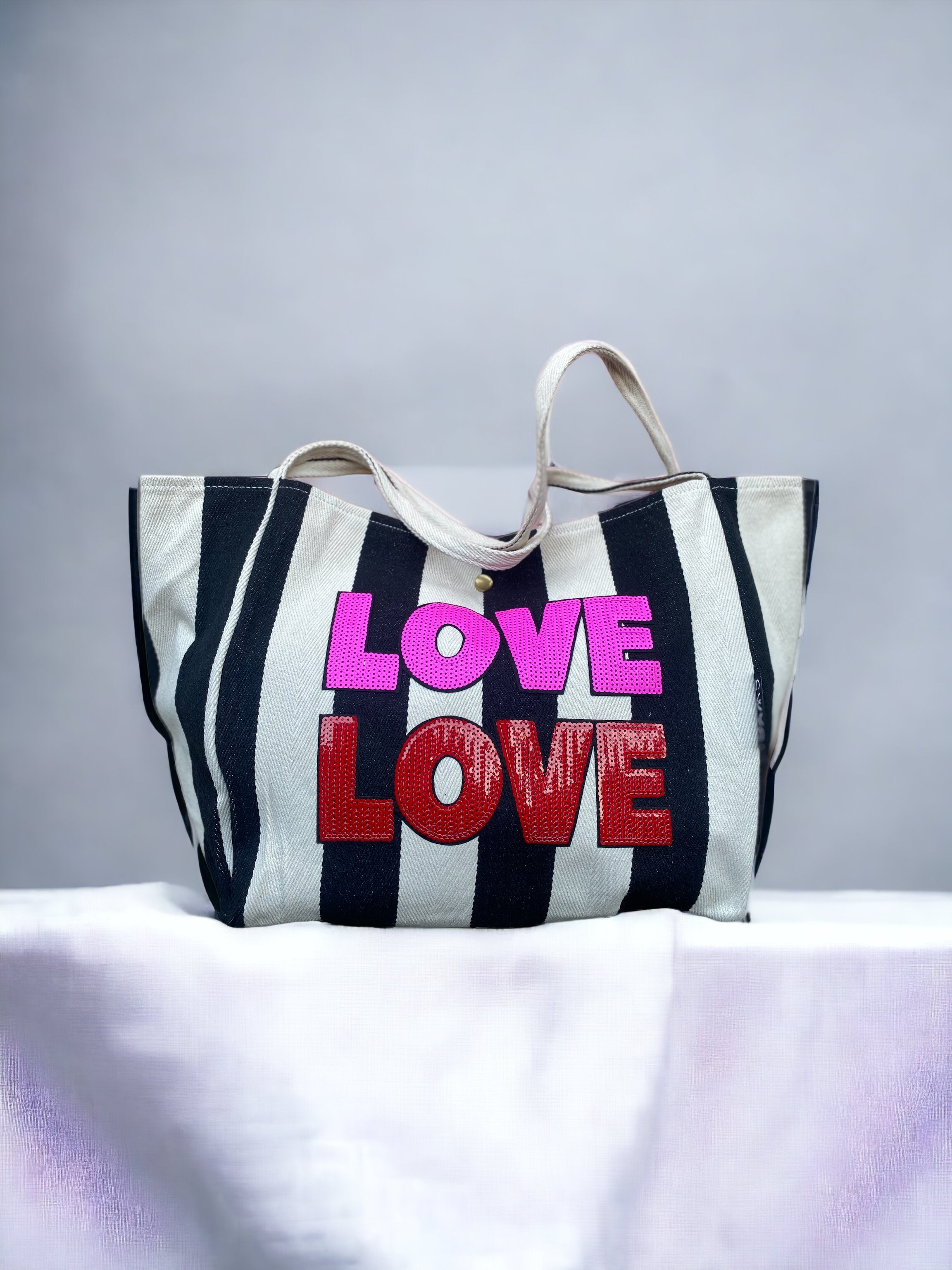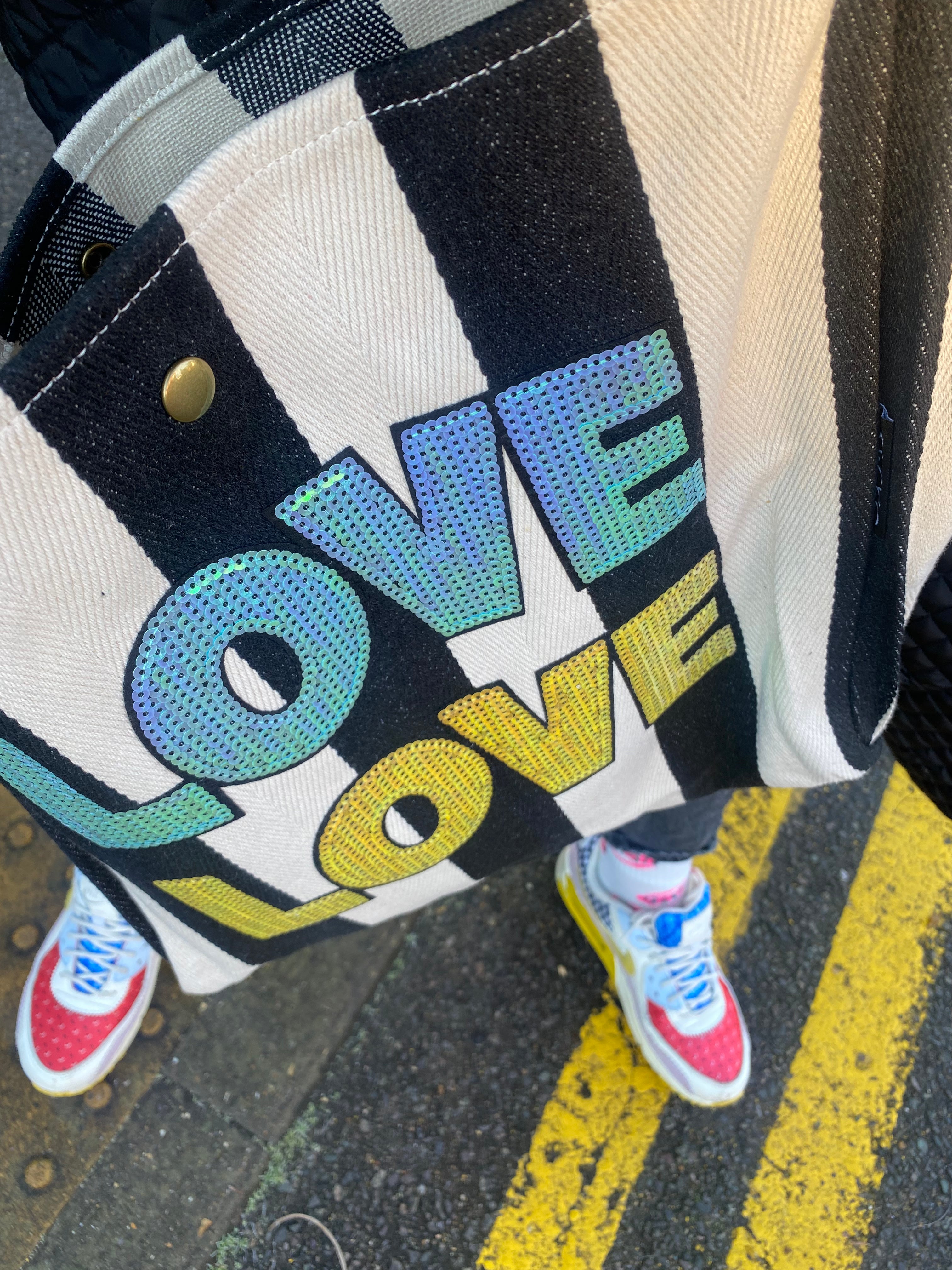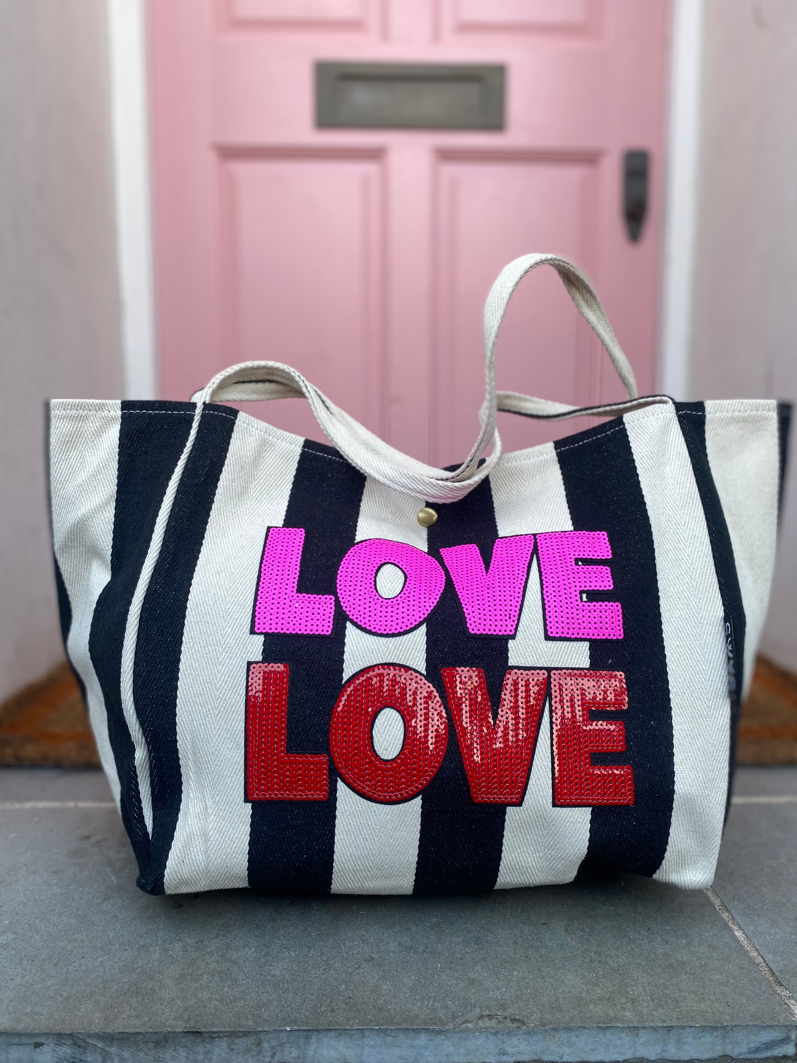 In retro stripes of black and off-white, we have added two of our massive sequin Love patches available in 2 colour ways. Makes a great statement day to day or on the beach or poolside!
