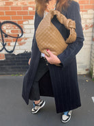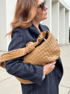 This woven shoulder bag brings texture and warmth to any look, with its soft shape and autumnal tone. Made from premium vegan leather, it’s lightweight, easy to carry, and spacious enough for everyday essentials.